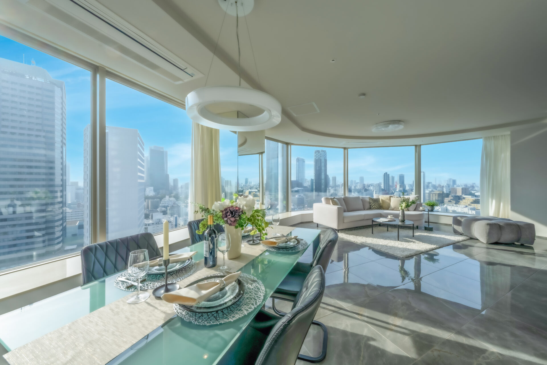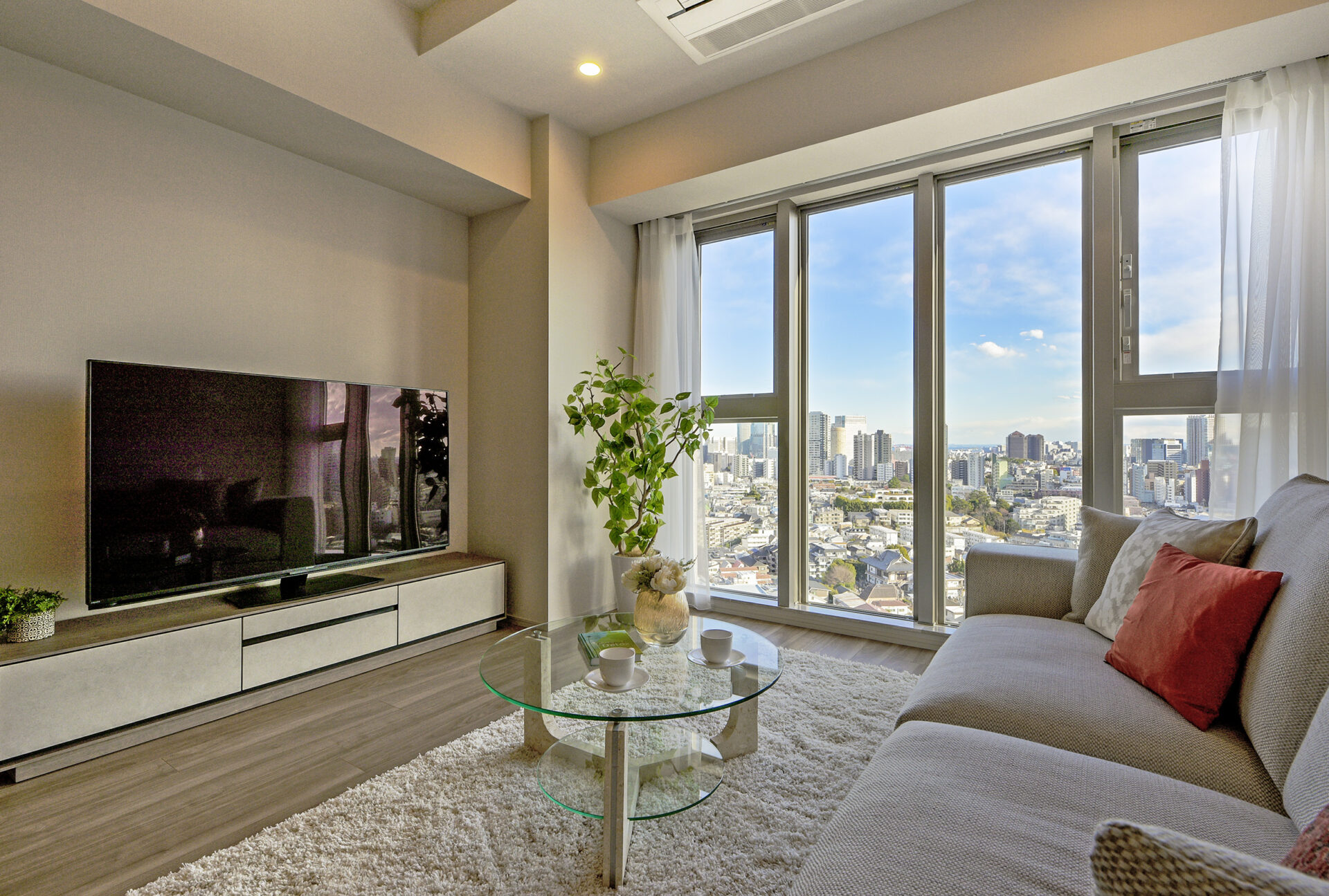 お部屋は日照に恵まれた南東向きの角部屋で、抜け感のある眺望も抜群。リビングの大きな窓の外にダイナミックな東京の街並みが広がります。