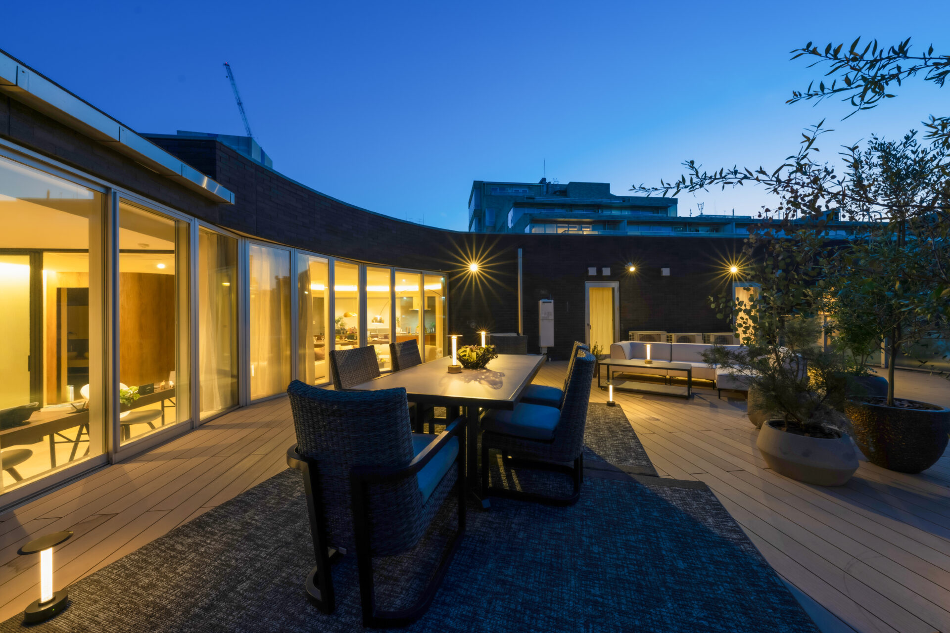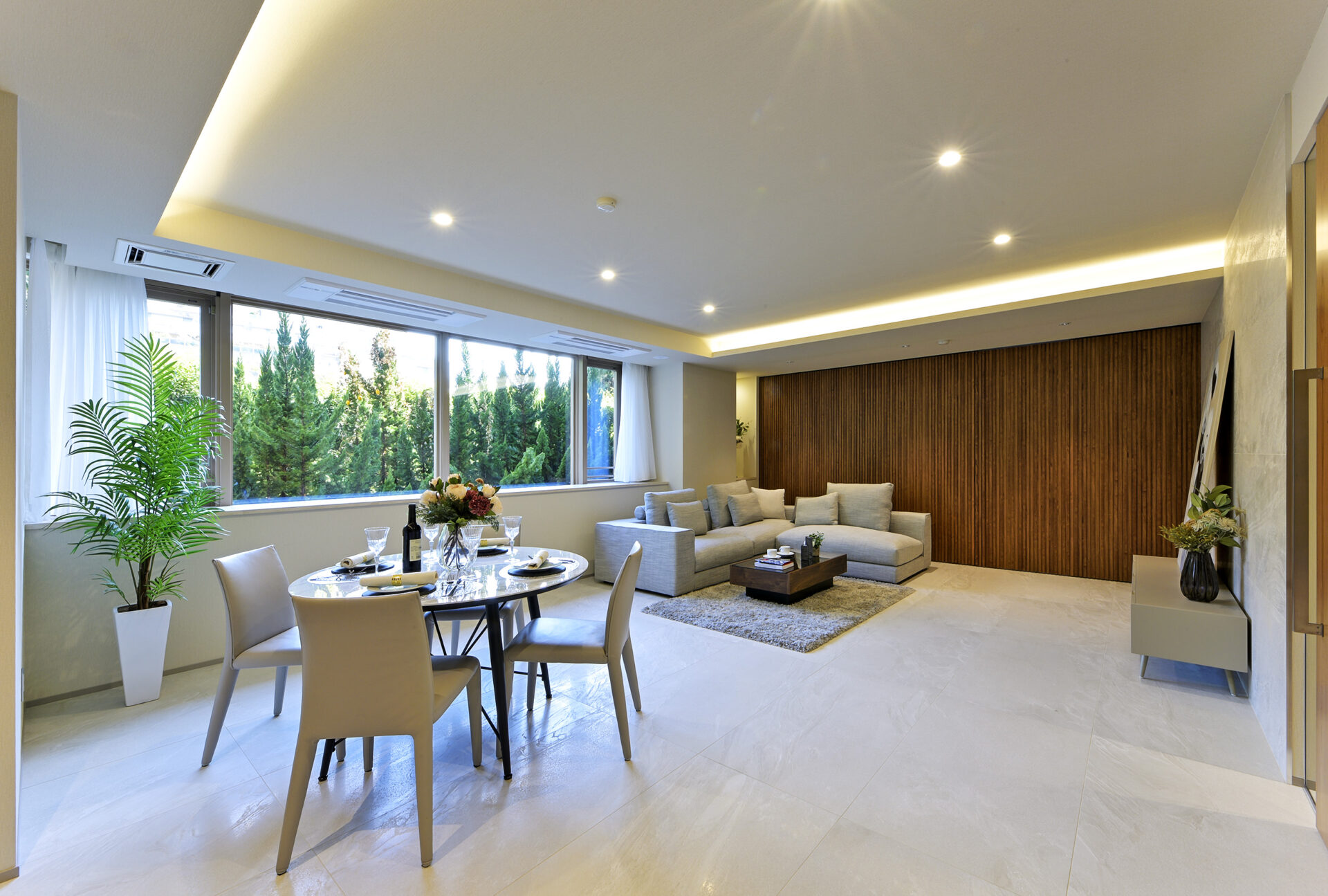 リビングには光がたっぷりと差し込み、昼は自然の明るさで満たされ、夜はムーディーな照明が優雅なひとときを演出します。